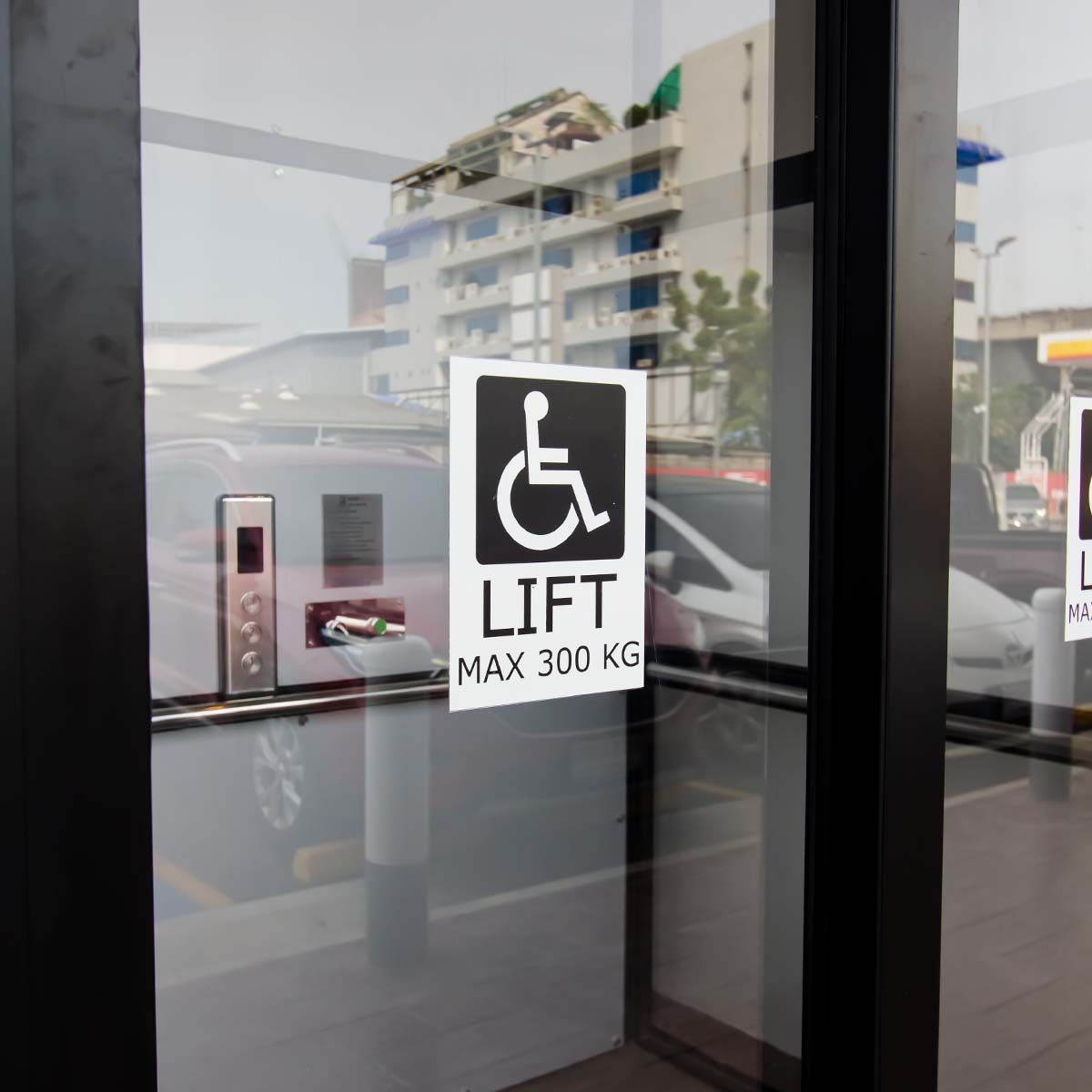 - มีป้ายแสดงหมายเลขชั้น และแสดงทิศทางขึ้นลงของลิฟท์ ซึ่งมีแสงไฟบริเวณโถงหน้าประตูลิฟท์ และติดอยู่ในตําแหน่งที่เห็นได้ชัดเจน