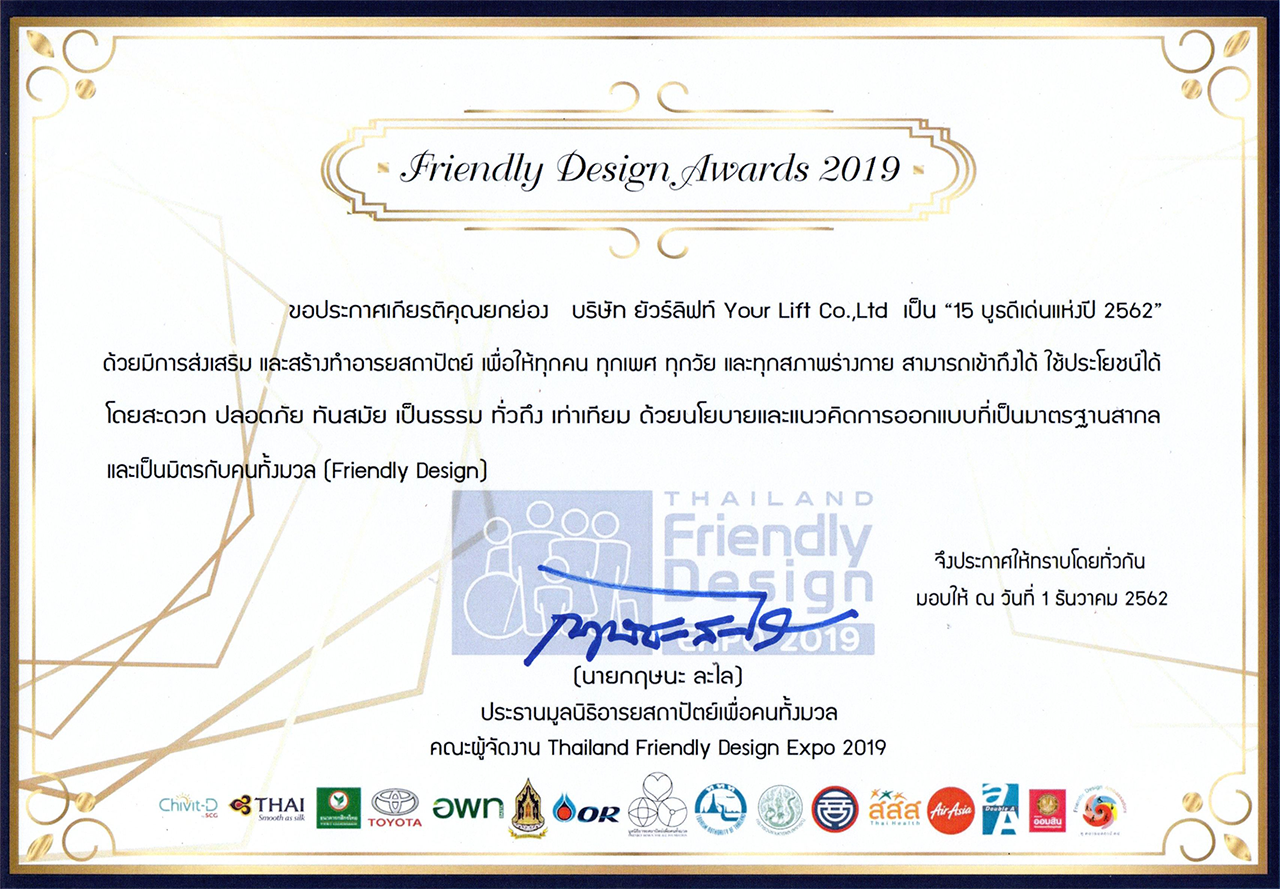 Your Lift ได้เข้าร่วมงาน Thailand Friendly Design Expo 2019 ครั้งที่ 4 เพื่อนำเสนอลิฟท์บ้านเพื่อผู้สูงอายุ ผู้ป่วยพักฟื้น ผู้พิการ และคนที่ใช้รถเข็น หรือบุคคลอื่นๆที่มีปัญหาการขึ้นลงระหว่างชั้นภายในบ้าน โดยเรามีแนวคิดว่า "เราต้องการเป็นส่วนหนึ่งที่จะช่วยเหลือผู้ที่กำลังประสบปัญหาในการขึ้นลงระหว่างชั้น ให้สามารถขึ้น-ลงไปทำกิจกรรมต่างๆได้อย่างสะดวกสบายมากที่สุด"